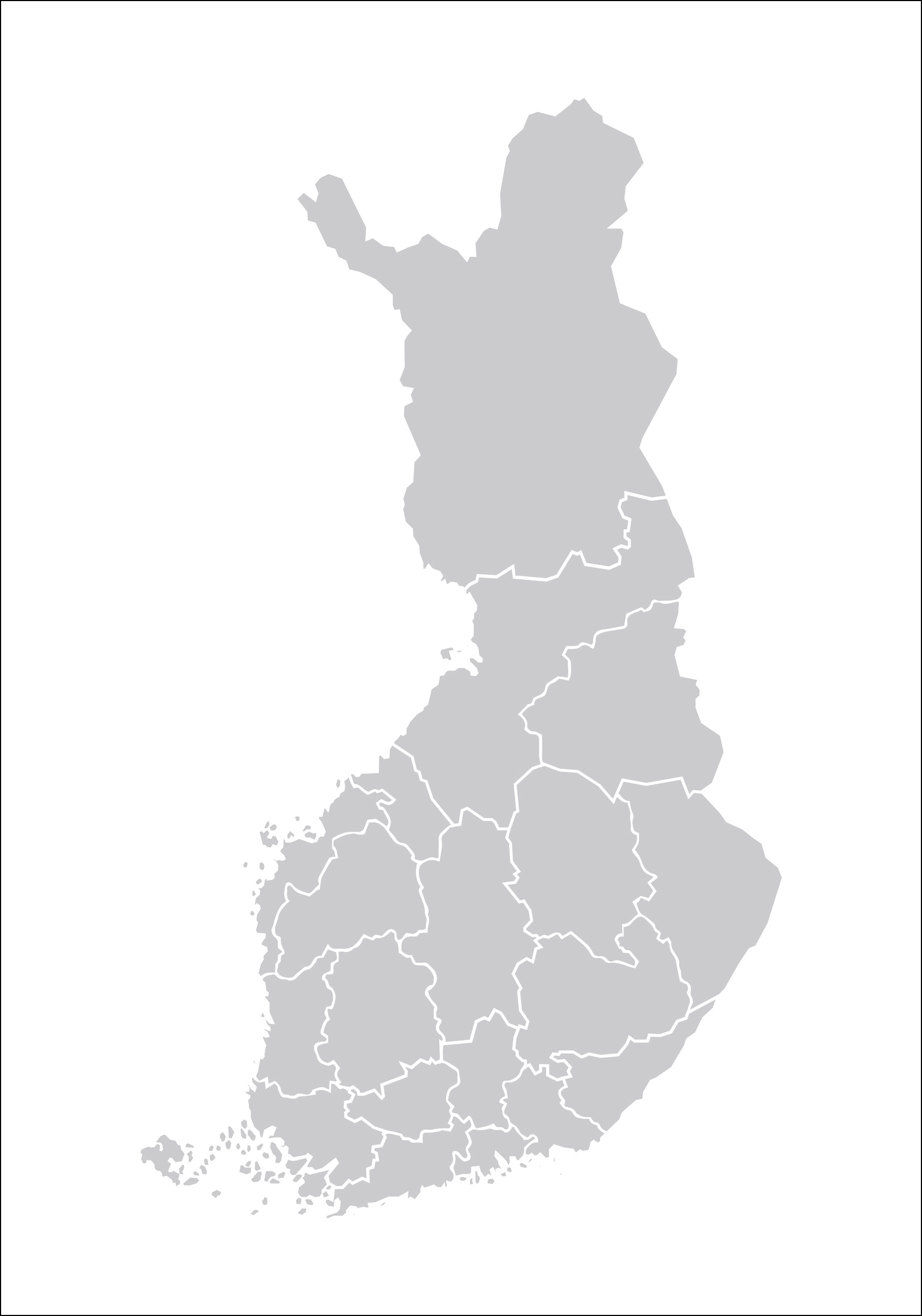 Suomijos žemėlapis, atspausdintas švelniai pilku atspalviu, kuriame regionai pažymėti balta linija, kad susilietų su baltu fonu. Diskretiškas ir tuo pat metu labai malonus akį traukiančiu elementu, tiek kaip atskiras plakatas, tiek kaip dalis didesnės paveikslų sienos?