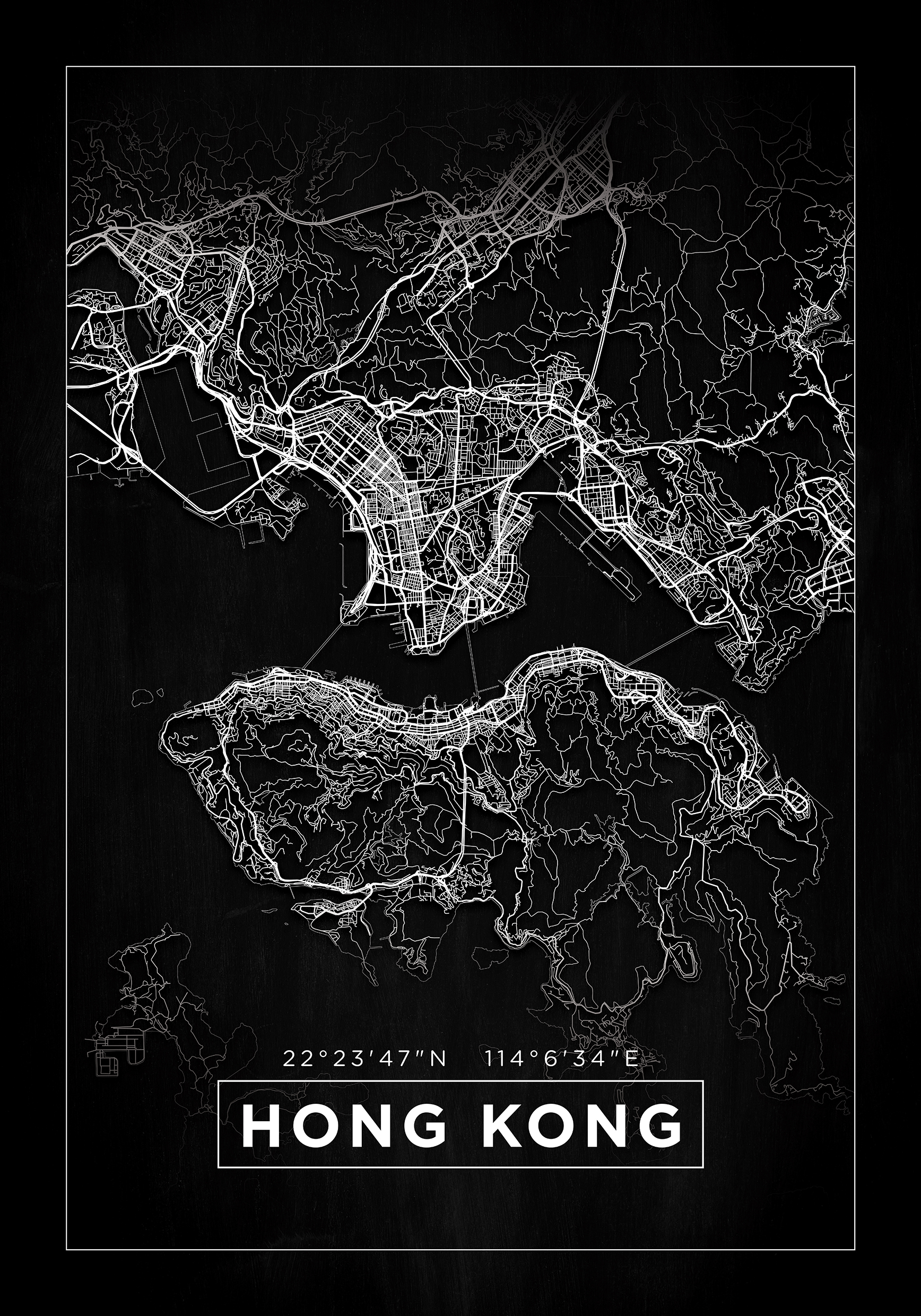 Čia turime miesto žemėlapį, kuris gali būti puiki dovana tiek jums, tiek žmogui, kuris ypatingai myli miestą ir laiko jį arti savo širdies! Romiai balti gatvės ir aikštės kontrastuoja su juodu fonu. Šiaurėje ir pietuose žemėlapis palaipsniui išnyksta, o apačioje įkomponuotas užrašas "Hong Kong" didžiosiomis baltosiomis raidėmis. Virš rėmo rodomi skaičiai, nurodantys geografines miesto koordinates. Žemėlapį juosia toks pat rėmas kaip ir miesto pavadinimą, o už jo yra platesnė juoda rėmelis, efektyviai padedantis sutelkti žvilgsnį ir nukreipti jį į paveikslo turinį. Nuostabus žemėlapio plakatas, kuris tikrai pritraukia dėmesį!