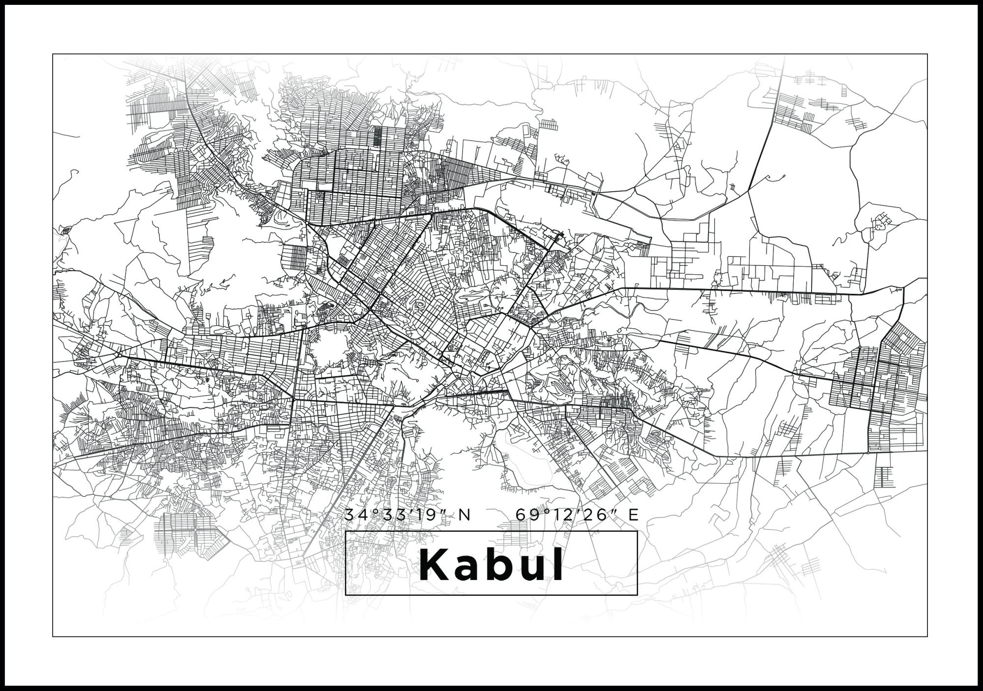 Šiame miesto žemėlapyje pateikiame Kabulą horizontaliame, elegantiškame baltos ir juodos spalvų formate. Apačioje paveikslėlyje matyti Kabulas, įrėmintas juodai, o viršuje nurodytos vietos koordinatės. Miesto žemėlapį supa juodas rėmelis tokio paties stiliaus kaip ir pavadinimas, o už jo yra šiek tiek platesnis baltas kraštas. Žemėlapio plakatas tiems, kurie mėgsta elegantišką ir švarų išraišką savo namuose!