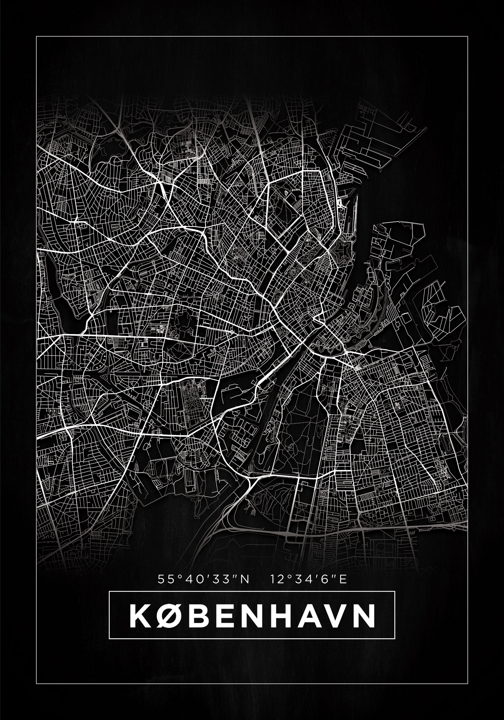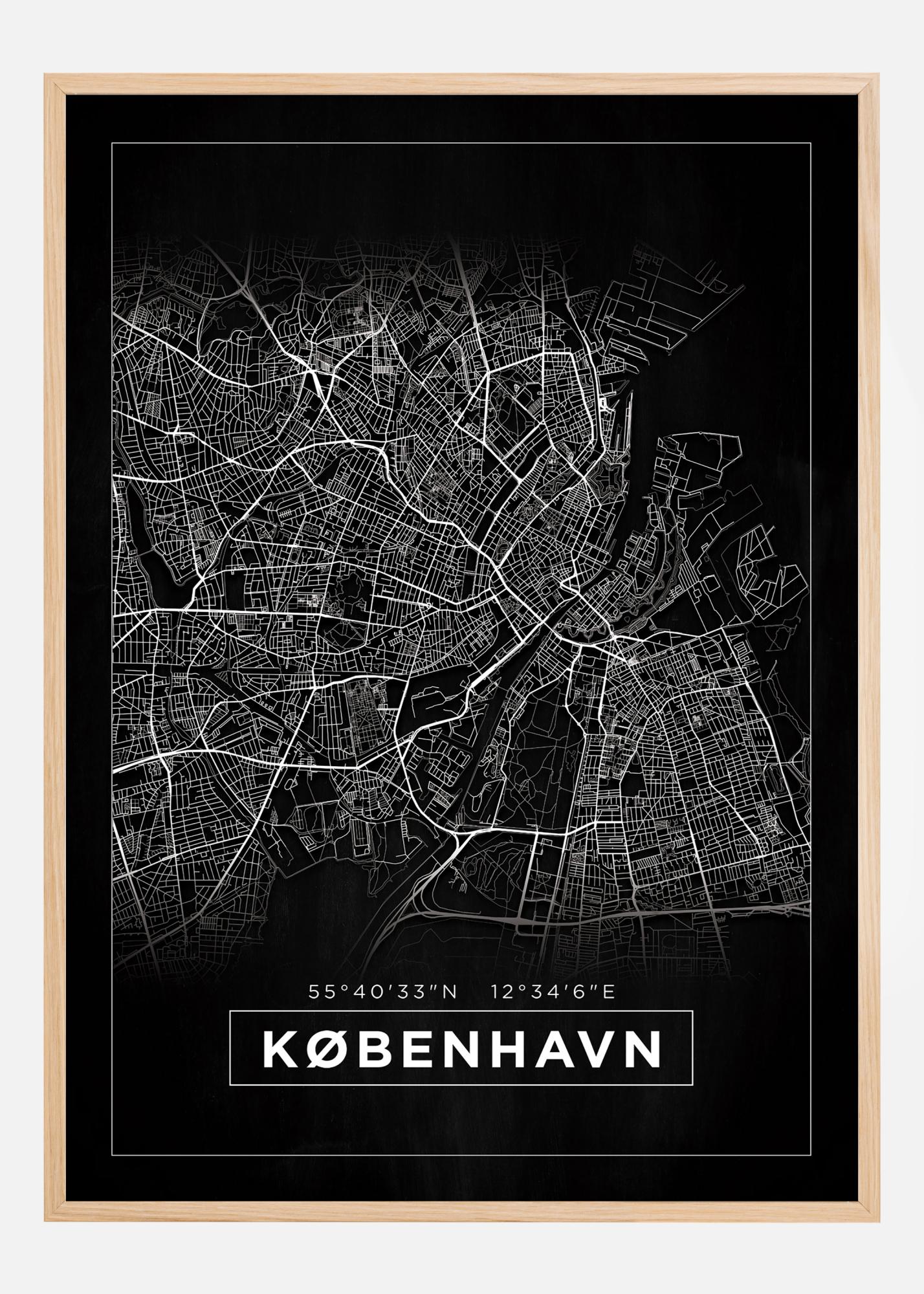 Čia turime tikrai įspūdingą Kopenhagos miesto žemėlapį juodai baltame formate. Čia matome visą miesto gatvės tinklą minimalistiškai besitęsiantį iš šiaurės į pietus. Viršuje ir apačioje žemėlapio vaizdas nublanksta, o baltos linijos dingsta prieš juodą foną. Platesnėje juodoje maržoje rasite ploną baltą rėmelį. Apačioje vaizde matomas Kopenhagos pavadinimas su danišku rašymu, kad suteiktų tinkamą jausmą, o virš jo nurodytos miesto koordinatės. Baltas rėmelis, apjuosiantis žemėlapį, taip pat rastas aplink miesto pavadinimą. Šis žemėlapio plakatas sukuria tikrai įspūdingus kontrastus ir suteikia tikrai malonų svorį savo vietoje. Tikras žvilgsnių traukiklis!