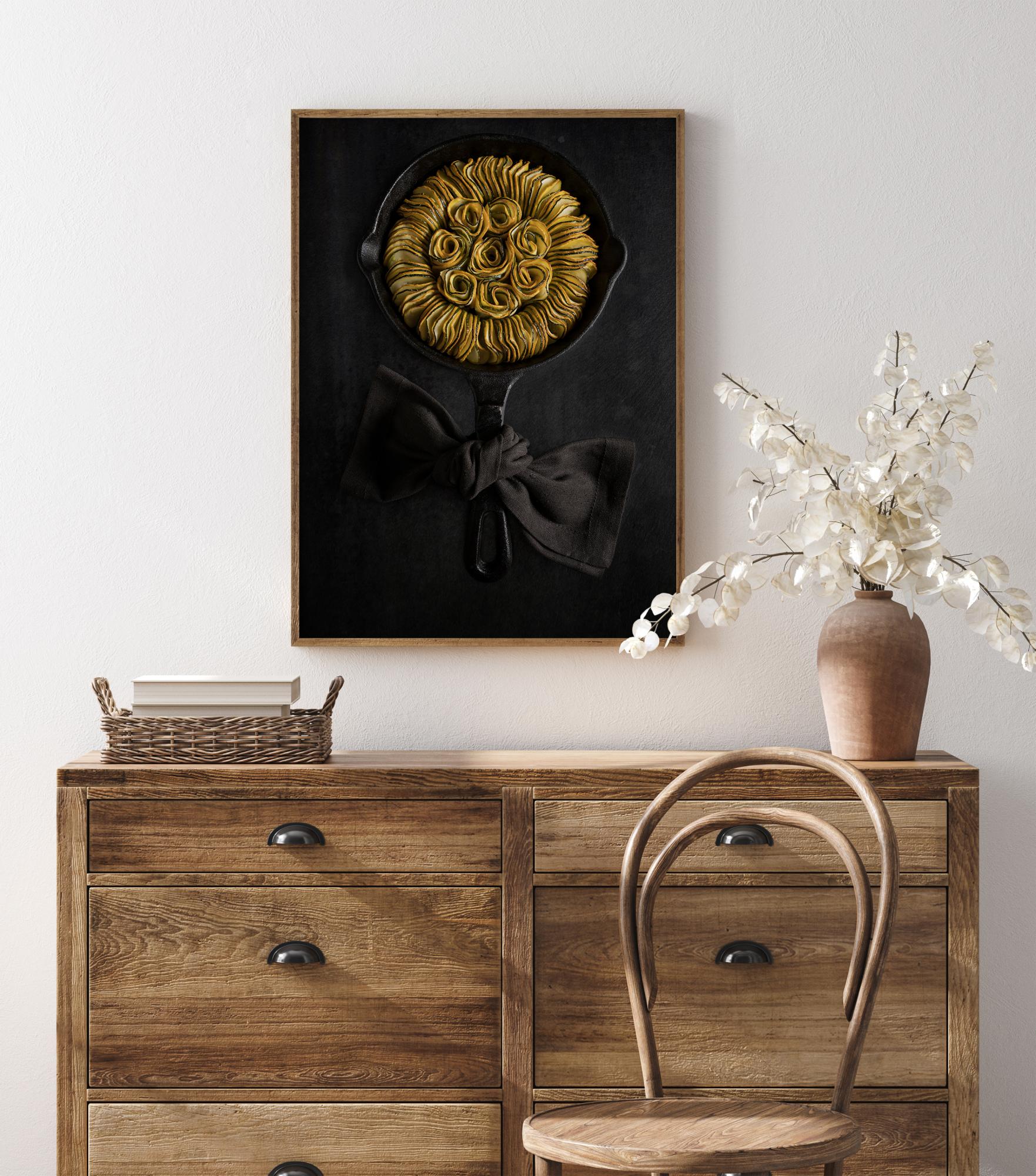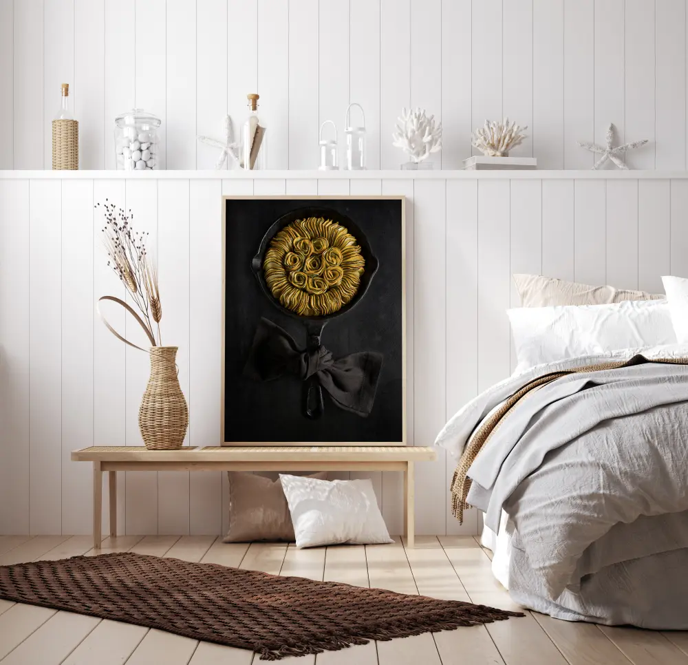 Puikus plakatas su ratatouille patiekalu su cukinijomis arba moliūgais, elegantiškai išdėstytais ketaus keptuvėje, sukuriančių įspūdingą saulėgrąžos formą. Geltonos ir žalios cukinijos išsiskiria ant juodos keptuvės su audinio lanku, surištu aplink rankeną. Pakabinkite šį savo virtuvėje ir pažiūrėkite, ar sugebėsite pagaminti šį viliojantį patiekalą.